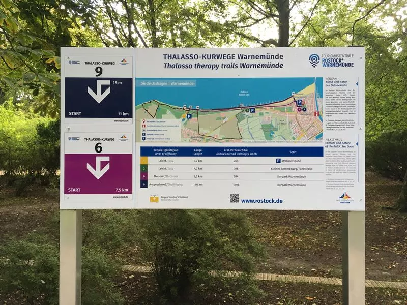Der anspruchsvolle Thalasso-Kurweg 9 führt Sie am Warnemünder Strand entlang Richtung Westen, durch den reizvollen Küstenwald im Seebad Diedrichshagen und zurück zum Startpunkt in Wassernähe. Die Audiotour vermittelt dabei neben kurzen Atem- und Achtsamkeitsübungen interessante Fakten zur Wirkung des Meeres und des Waldes auf die Gesundheit, zum Naturschutzgebiet Stoltera oder auch zu den Buhnen und Möwen im Seebad. Die klimatische Reizintensität ist aufgrund des vorrangig bestehenden Westwindes und der Sonneneinstrahlung z.T. hoch.Achten Sie im Hochsommer bitte darauf, Ihre Wanderung am Morgen zu beginnen und laufen Sie nur so schnell und so weit, wie Sie sich gut dabei fühlen! Hinweise und Tipps zur Audiotour: Lieber Nutzer, liebe Nutzerin,während der Thalasso-Wanderung wird via GPS-Ortung Ihr Standort bestimmt. Folgen Sie nach dem Start der Ausschilderung Ihrer gewählten Tour. Die verschiedenen Audiostationen werden auf der Tour selbstständig beginnen. Wir empfehlen Ihnen, die Audiotour vorab über den QR Code herunterzuladen und Kopfhörer zu nutzen. Für längere Wanderungen empfehlen wir zudem die Mitnahme einer Powerbank. Für nähere Auskünfte wenden Sie sich gern an die Tourismuszentrale Rostock & Warnemünde. IMPRESSUM:© Herausgeber der Audiotour: Hanse- und Universitätsstadt Rostock, Tourismuszentrale Rostock & Warnemünde, Am Strom 59, 18119 Rostock-Warnemünde. Fotos: TZRW, Dr. Andrea Werner von Wohlauf4u sowie Joachim Kloock (Foto: Station 14 / Kreuzfahrttourismus). Urheberin der Texte: Frau Dr. Werner von Wohlauf4u. Sprecherin für die deutsche Audiotour: Frau Sandra Uma Schmitz. Verantwortlich für die Tonaufnahmen: Tonstudio an der Hochschule Stralsund.Alle Angaben und Daten nach besten Wissen und Gewissen, aber ohne Gewähr auf Vollständigkeit und Richtigkeit. Ein Nachdruck auch auszugsweise und die Weitergabe an Dritte ist nicht gestattet. Alle Rechte sind vorbehalten.